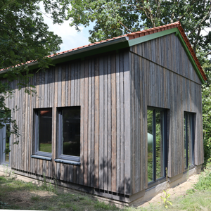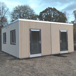 | Besonderheiten | Fassade aus acryl‑beschichtetem Gewebe, innen OSB‑Platten, Satteldach 10° |