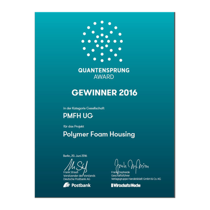 Auszeichnung für besondere Innovationskraft im Bauwesen. Der Award würdigt die PMFTechnologie als zukunftsweisenden Ansatz für nachhaltiges und wirtschaftliches Bauen.